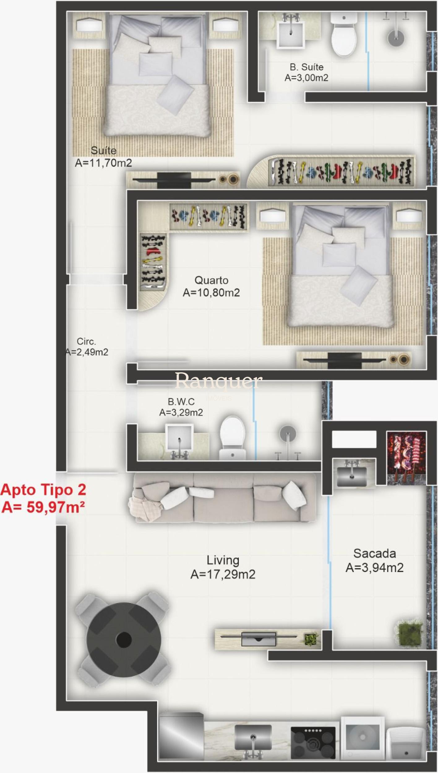 2 quartos (sendo 2 suítes)