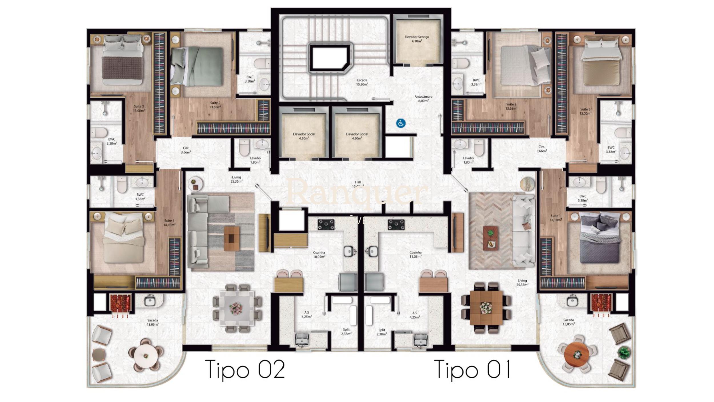 3 quartos (sendo 3 suítes)