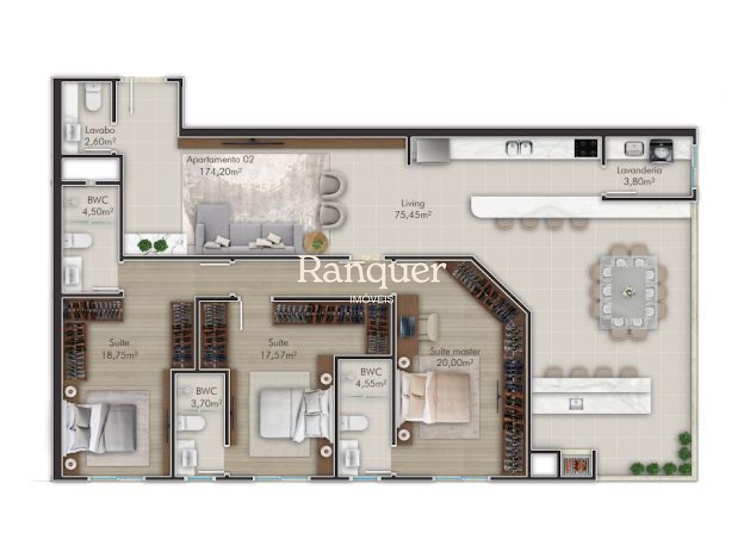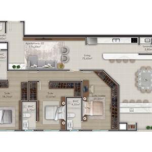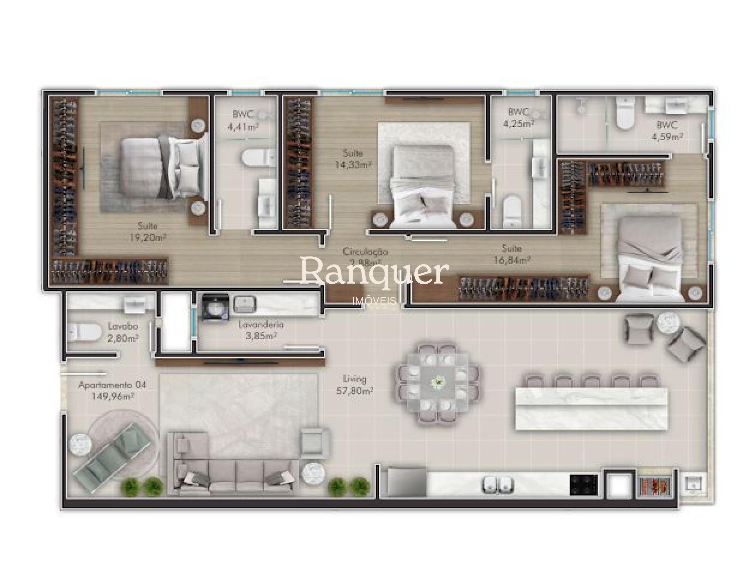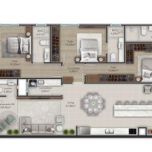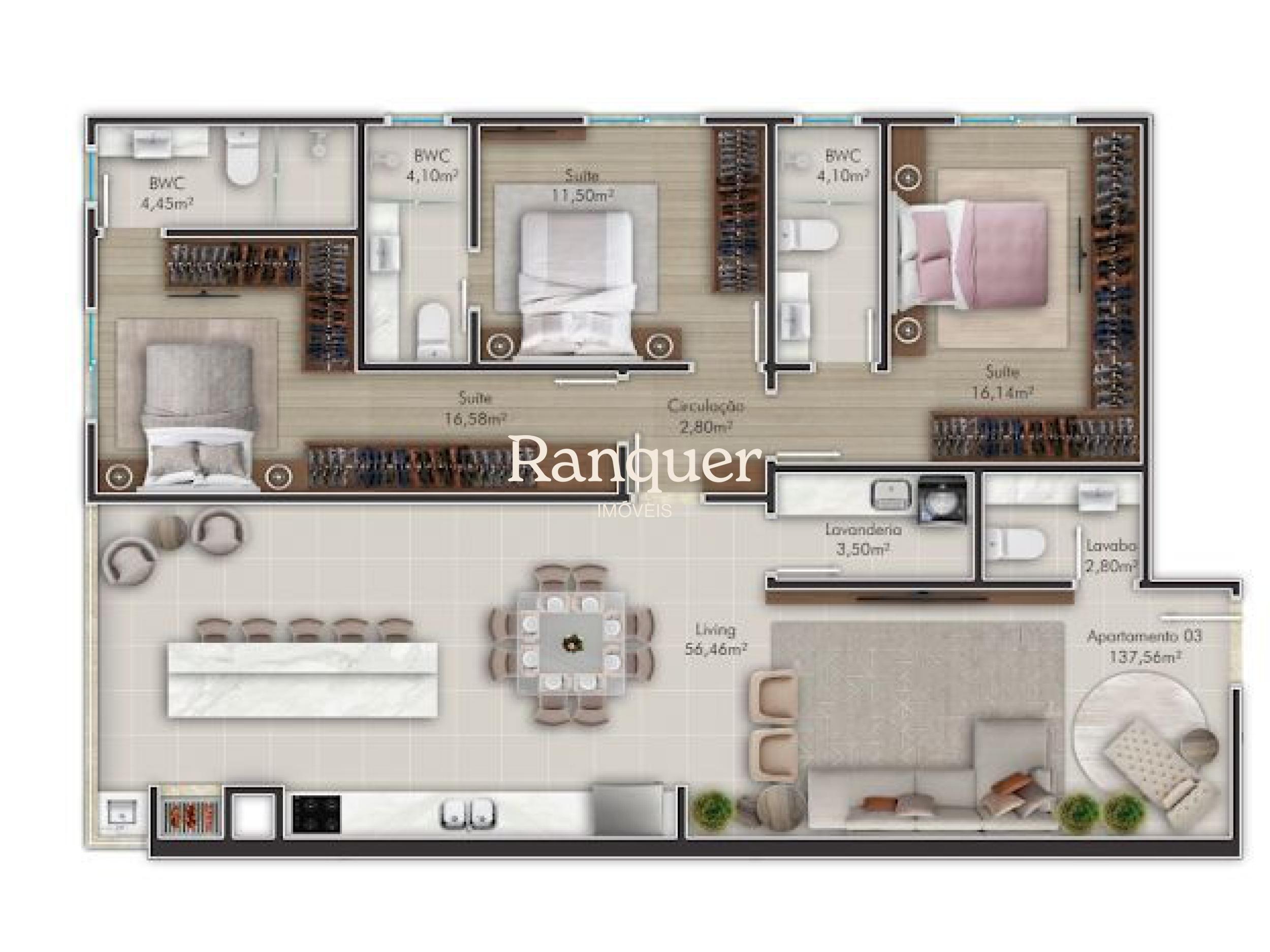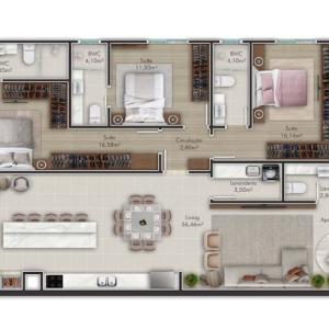 3 quartos (sendo 3 suítes)